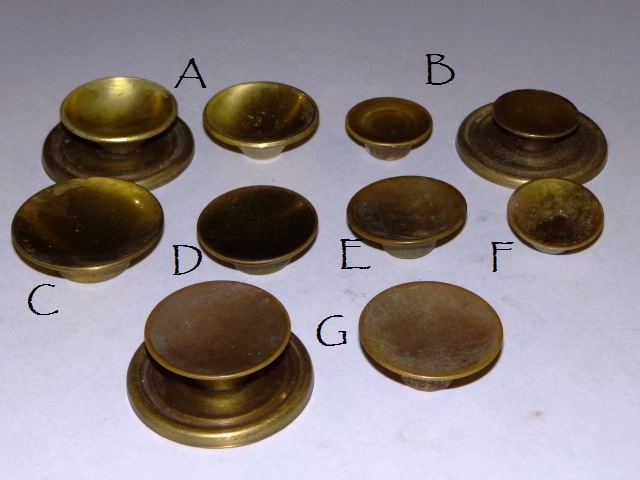 Price: $7.95 ea. Available: A. 18 Brass Finish, 2" B. 4 Brass Finish, 1-1/2" C. 6 Brass Finish, 2-1/4" D. 8 Chrome-Finish, 1-7/8" E. 3 Chrome-Finish, 1-3/4" F. 2 Chrome-Finish, 1-1/2" G. 2 Chrome-Finish, 2" Quantity: